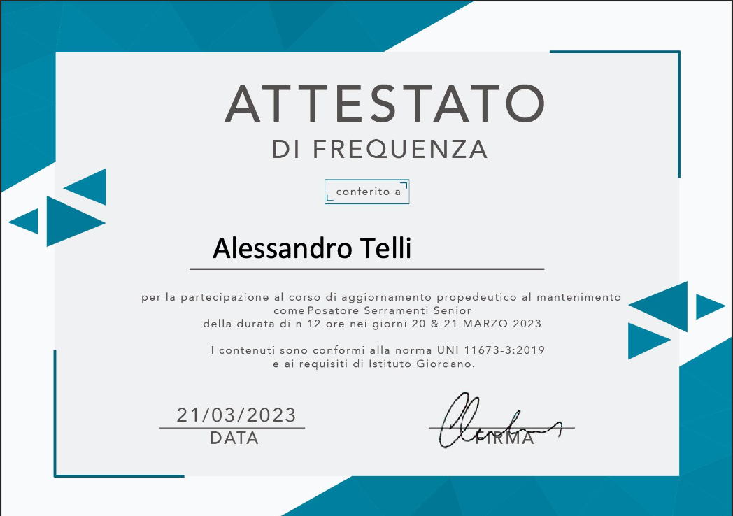 Inoltre siamo certificati EN ISO 9001:2015, per la Fornitura, posa e installazione di serramenti, manutenzione di